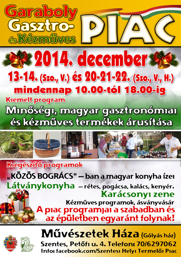 A hűvösre forduló idő miatt kis átrendeződés lesz a Garaboly Gasztro- és Kézműves piacon. A piac programjai most már nem csak a szabadban hanem az épületben is folynak. Azért reméljük, hogy mindenki megtalálja kedvenc árusát! Jöjjön el Ön is december és 20-22 között!