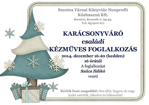 2014. december 16-án 16.00 órától KARÁCSONYVÁRÓ KÉZMŰVES FOGLALKOZÁS lesz a Városi Könyvtárban, melyet Szűcs Ildikó vezet. Ha szeretnél részt venni, akkor hozz magaddal: éles ollót, hegyes, de nagy lyukú varrótűt, jókedvet és lelkesedést!