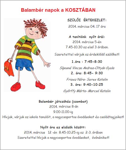 Balambér Napokra várják a Koszta József Általános Iskola iránt érdeklődő szülőket és gyermekeket. 2014. március 4-én szülői tájékoztató értekezlettel kezdődik a Balambér Napok.