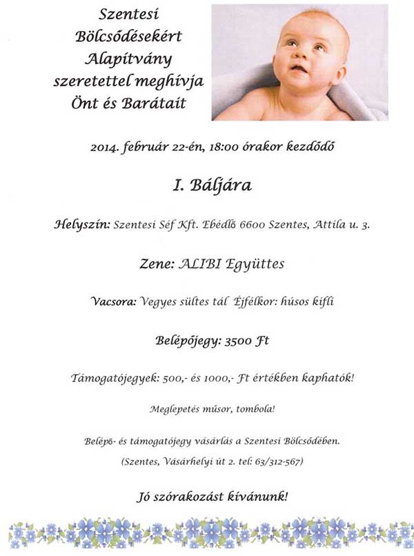 A Szentesi Bölcsődésekért Alapítvány meghívja Önt és Barátait a 2014. február 22-én megrendezendő I. Bölcsődei Bálra. Jegyek korlátozott számban még kaphatók! További információ a plakáton!