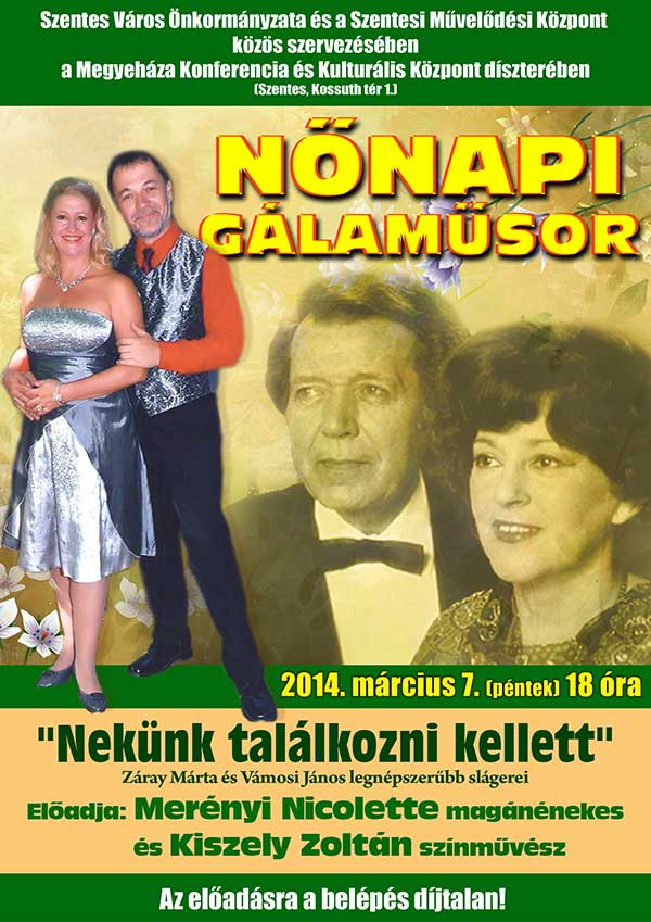 Évek óta hagyomány már, hogy Szentes Város Önkormányzata és a Szentesi Művelődési Központ Nőnap alkalmából egy színvonalas gálaműsorral kedveskedik a város hölgy tagjainak. Az eddigi műsorokban volt már operett, musical, nóta összeállítás, melyek mindig nagy sikert arattak a nézők körében. Az idén március 7-én /pénteken/ 18 órától a Megyeháza Konferencia és Kulturális Központ dísztermében „Nekünk találkozni kellett” címmel a népszerű művészházaspár, Záray Márta és Vámosi János legnagyobb slágereiből hallhatnak ízelítőt Merényi Nicolette magánénekes és Kiszely Zoltán színművész előadásában. A rendezvényre mindenkit szeretettel várnak a szervezők!