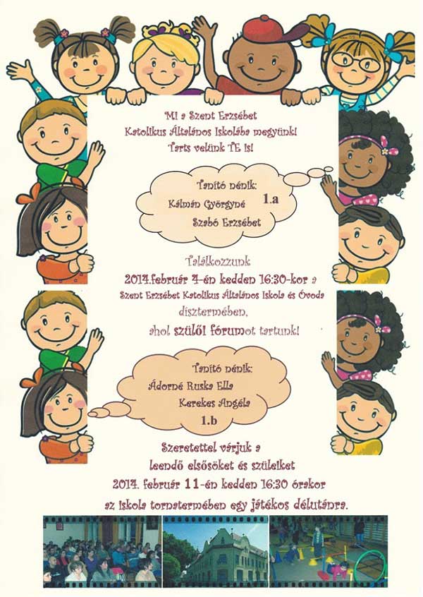 2014. február 4-én délután szülői fórumra várják a Szent Erzsébet Kat. Általános Iskola iránt érdeklődő leendő elsősök szüleit. Majd egy héttel később a gyermekek szüleikkel egy játékos délutánon vehetnek részt az iskola tornatermében.