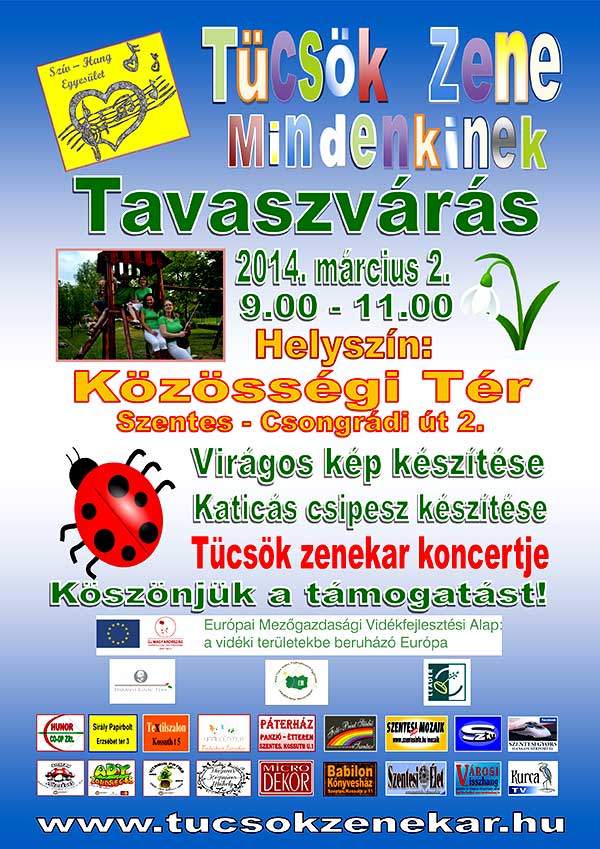 2014. március 2-án közös tavaszvárásra hívnak minden gyermeket és szüleiket a Tücsök Klubba. Délelőtt 9.00-11.00 óráig tartó klubfoglalkozáson virágos képet, valamint katicás csipeszt készíthatnek a gyermekek a kézműves foglalkozáson, és ezután nem maradhat el a Tücsök Zenekar koncertje. Minden érdeklődőt szeretettel várnak.