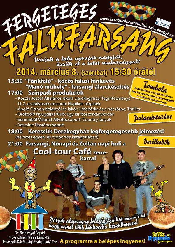 A délután tombolahúzással és a Cool-tour Café zenekar nőnapi és Zoltán napi koncertjével zárul. Szeretettel várnak a szervezők minden kedves érdeklődőt a derekegyházi Falufarsangra!