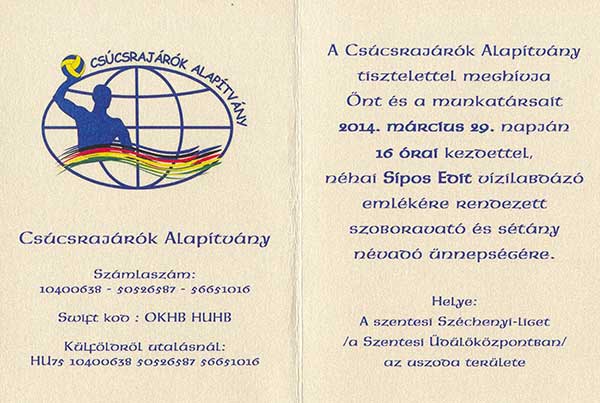 A Csúcsrajárók Alapítvány tisztelettel meghívja Önt 2014. március 29-én 16.00 órai kezdettel néhai Sípos Edit vízilabdázó emlékére rendezett szoboravató és sétány névadó ünnepségre. Az eseményen beszédet mond Merész András, a magyar női vízilabda válogatott szövetségi kapitánya.