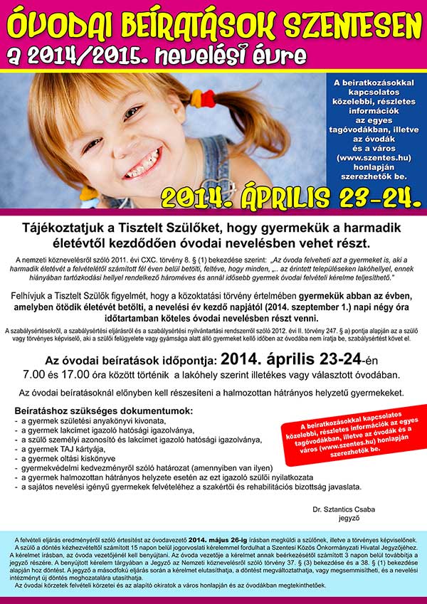 A beiratkozásokkal kapcsolatos közelebbi, részletes információk az egyes tagóvodákban, illetve az óvodák és a város ( www.szentes.hu ) honlapján szerezhetők be. Dr. Sztantics Csaba jegyző Kinagyítható!