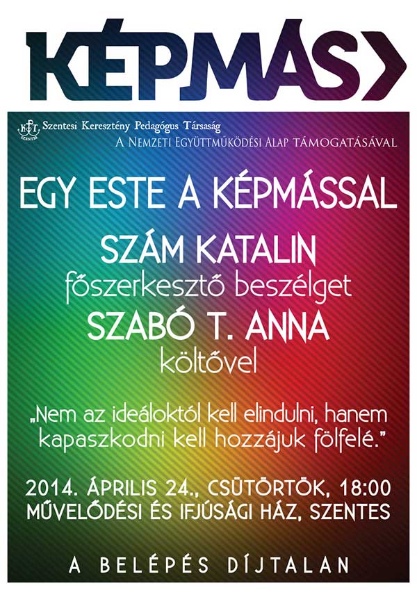 2014. április 24-én Egy este a képmással címmel Szám Katalin főszerkesztő beszélget Szabó T. Anna költővel a Művelődési és Ifjúsági Házban este 18.00 órakor. A beszélgetésre, minden érdeklődőt szeretettel várnak!