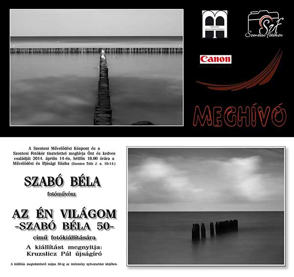 A Szentesi Művelődési Központ és a Szentesi Fotókör tisztelettel meghívja Önt és kedves családját 2014. április 14-én, hétfőn 18.00 órára a Művelődési és Ifjúsági Házba (Szentes Tóth J. u. 10-14.) Szabó Béla fotóművész - Az én világom (Szabó Béla 50) című fotókiállításra.