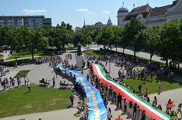 Szentes - 250 méter hosszú székely, illetve magyar zászlót hoztak magukkal azok a sepsiszentgyörgyi diákok, akik a HMG drámatagozatának meghívására érkeztek a városba.