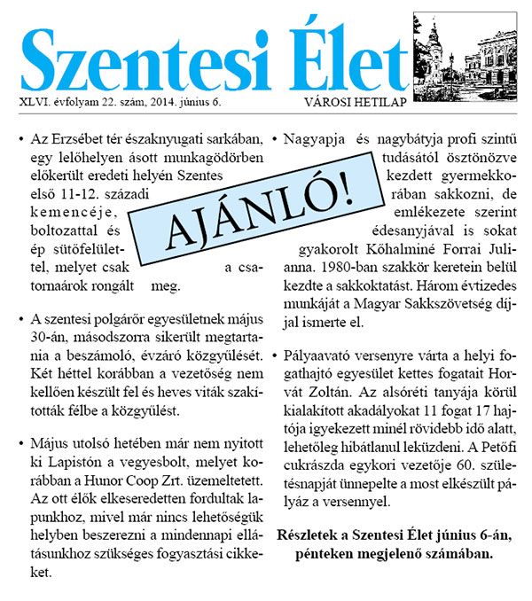 - Pályaavató versenyre várta a helyi fogathajtó egyesület kettes fogatait Horvát Zoltán. Az alsóréti tanyája körül kialakított akadályokat 11 fogat 17 hajtója igyekezett minél rövidebb idő alatt, lehetőleg hibátlanul leküzdeni. A Petőfi cukrászda egykori vezetője 60. születésnapját ünnepelte a most elkészült pályáz a versennyel. Részletek a Szentesi Élet június 6-án, pénteken megjelenő számában.