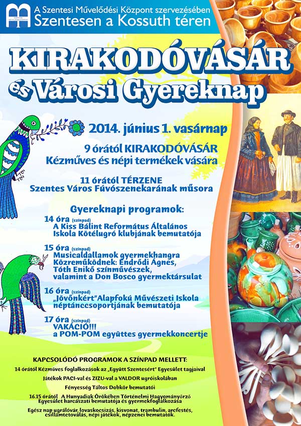 Június 1-jén, vasárnap rendezik idén a népi kirakodóvásárral egybekötött városi gyermeknapot a Kossuth téren. A Szentesi Művelődési Központ szervezésében megvalósuló rendezvényen egész napos szórakozás, népi és népzenei játékok, gyermekkoncertek, kisvonat, ugrálóvár, trambulin és még számos kiegészítő program várja a gyerekeket. Részletek a plakáton!