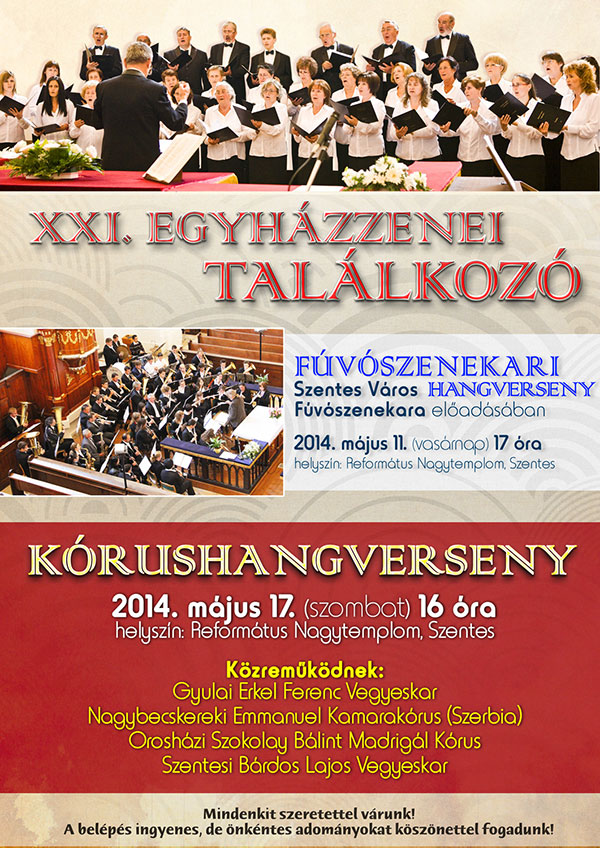 A Szentesi Zenebarátok egyesülete és az Egyházközségek közös szervezésében rendezik meg Szentesen a XXI. Egyházzenei találkozót. 2014. május 17-én lesz a kórusok találkozója a Református Nagytemplomban, de előtte szintén az egyházzenei találkozó keretei belül ad hangversenyt Szentes Város Fúvószenekara. A 2014. május 11-én megrendezett eseményre is díjtalan a belépés.