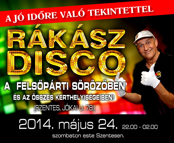 Az elmúlt hetekben többen kérdezték, hogy mikor lesz újra Rákász Disco Szentesen, mert ismételten egy hatalmasat akarnak bulizni. A jó időre való tekintettel: RÁKÁSZ DISCO A FELSŐPÁRTI SÖRÖZŐBEN (SZENTES, Jókai u. 78.) és az összes kerthelyiségeiben lesz 2014. május 24-én, szombaton este 22:00-tól 02:00-ig!