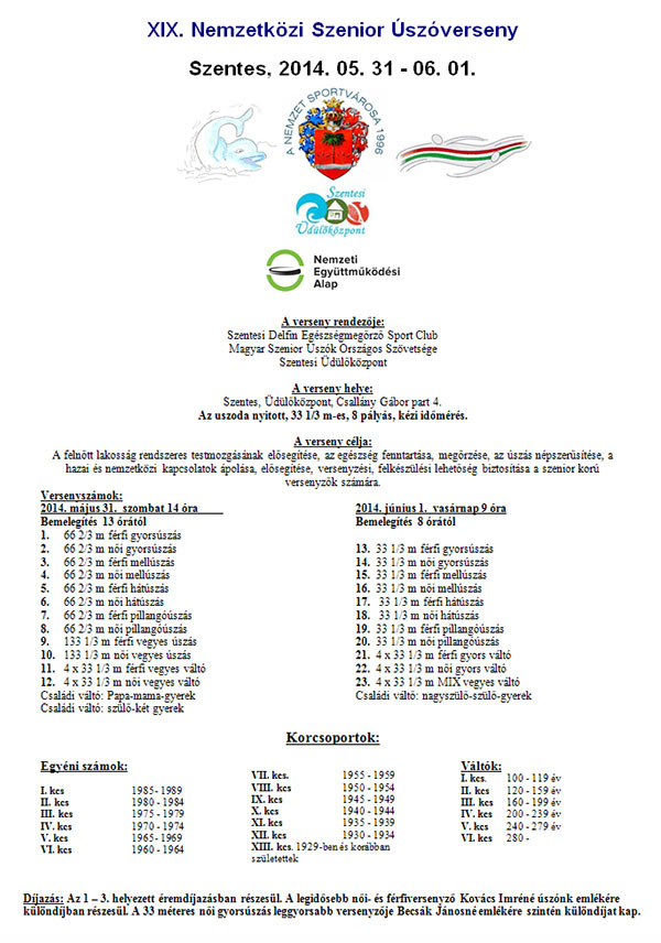 XIX. Nemzetközi Szenior Úszóverseny programja Szentes, 2014. 05. 31 - 06. 01.
