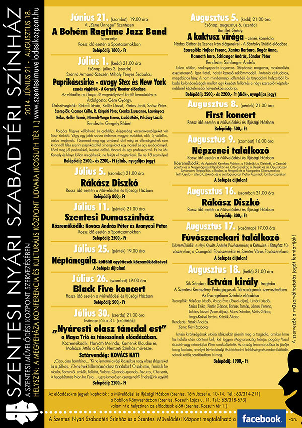 A Szentesi Nyári Színház 2014. június 21-én egy ragtime, jazz koncerttel indul, és István király - tragédiával zárul augusztus 18-án.