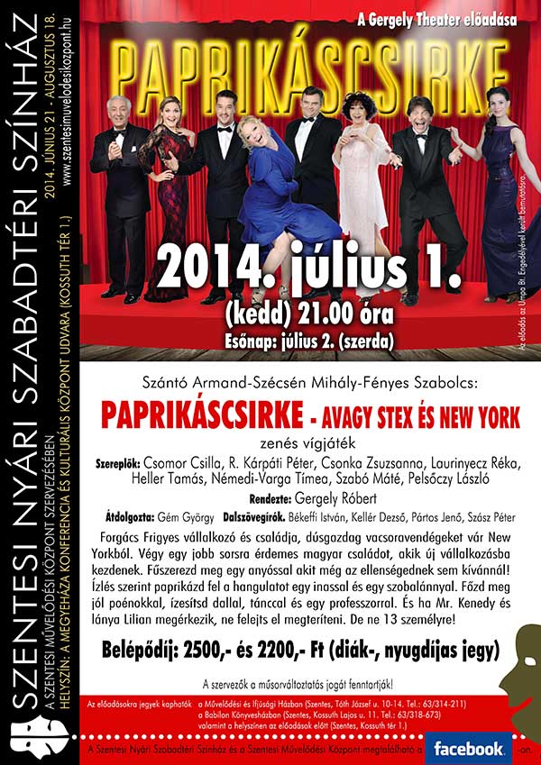 Június 21-én a „Zene Ünnepe” Szentesen címmel a Bohém Ragtime Jazz Band koncertjét hallhatjuk a Megyeháza udvarán. Július 1-jén Szántó Armand-Szécsén Mihály-Fényes Szabolcs: Paprikáscsirke -avagy Stex és New York- zenés vígjátékán szórakozhatunk, melyet olyan művészek adnak elő, mint Csomor Csilla, R. Kárpáti Péter, Csonka Zsuzsanna, Laurinyecz Réka, Heller Tamás, Némedi-Varga Tímea, Szabó Máté, Pelsőczy László. A darabot Gergely Róbert rendezte.