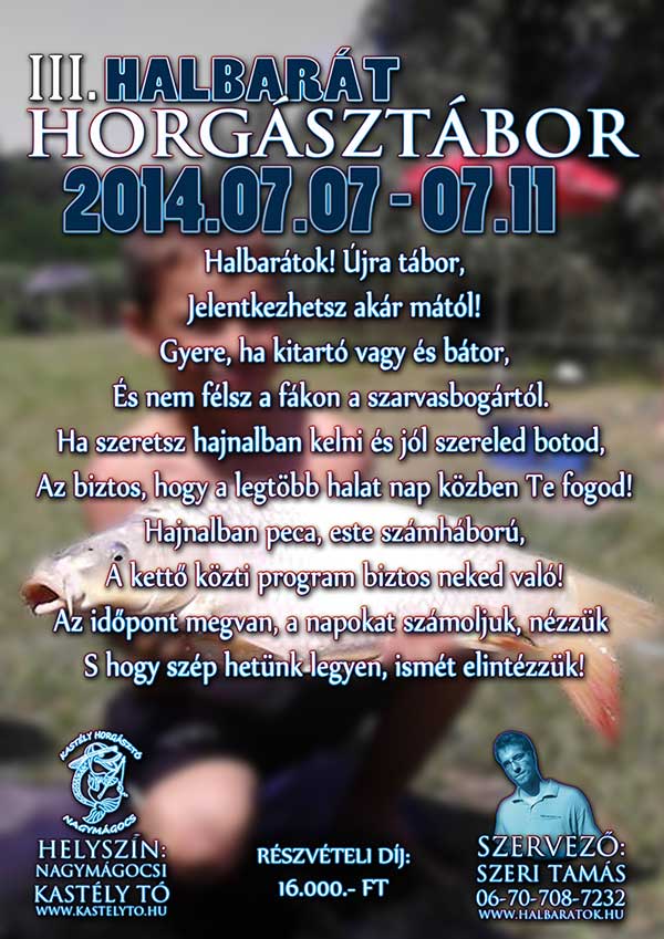 Elmúlt évek sikere után idén még több hallal, programmal, versenyekkel várunk minden lurkót. Táborunk kiemelkedő programja július 09-én (szerda) lesz, amikor a 2012-es év feeder világbajnoka és kétszeres feeder Magyar Bajnok - Erdei Attila fog egész napos előadást és bemutatót tartani a csapatával. Az idei horgásztábor 2014. JÚLIUS 07. (HÉTFŐ) – JÚLIUS 11. (PÉNTEK) között lesz megtartva. Kiköltözés már Július 06-án. VASÁRNAP ESTE lesz. Horgászbemutatók, kézműves foglalkozások, horgászverseny, sportversenyek, vízi olimpia, és sok színes program vár benneteket. Részvételi díj: 16.000 Forint. Érdeklődni és jelentkezni: Szeri Tamás 06/70/708-7232
