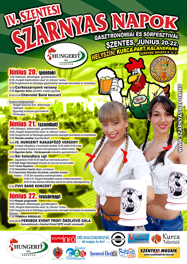 Hamarosan kezdődik a várva várt IV. Szentesi Szárnyas Napok! A pénteken nyitó kisüzemi sörfőzdékben kóstolhatók lesznek a legkülönfélébb sörök. Kapható lesz többféle gyümölcsös, barna, ír jellegű vörös, fekete, világos és szűretlen sör is. Többek között két kitelepülő csárda is gondoskodni fog arról, hogy senki ne maradhasson éhen, de természetesen nem hiányozhat majd a kürtőskalács, és egyéb finomság sem. Minden napra jut vidámság az idei évi rendezvényen is. Pénteken csirkeszárnyevő verseny, operettek és a Chevrolett Band fergeteges rock and roll koncertje gondoskodik a jókedvről. Szombaton délelőtti és délutáni gyermekprogramok, népdal, néptánc előadások, és persze az elmaradhatatlan Sör kalandtúra, valamint sörkirály választás lesz a jókedv alapja. Nem kérdés, hogy a rendezvény fő attrakciója mégis a szombaton 14:00 órakor rajtoló IV. Hungerit Kakasfőző verseny lesz, amelyre idén már több mint 100 csapat nevezett. Természetesen összeállt a kakas ételcsodákat bíráló zsűri is, amelynek –mint ahogy tavaly is - Szűcs Lajos alpolgármester, Márton Mária (Üdülőközpont igazgató), is tagja lesz. A zsűri elnök pozícióra a szervezőség ez évben a szentesi mesterszakácsot, Dömsödi Imrét kérte fel, aki örömmel vállalta a feladatot. Az idei zsűrinek egy igazi szakács híresség is tagja lesz. Toókos Ferenc (Olimpiai és Világbajnok mesterszakács, szakácsmester, Magyar Nemzeti Válogatott tagja) tudása és szakértelme is segít a döntésben, mely szerint eldől majd, hogy melyik csapat főzi idén a legfinomabb kakaspörköltet Szentesen.