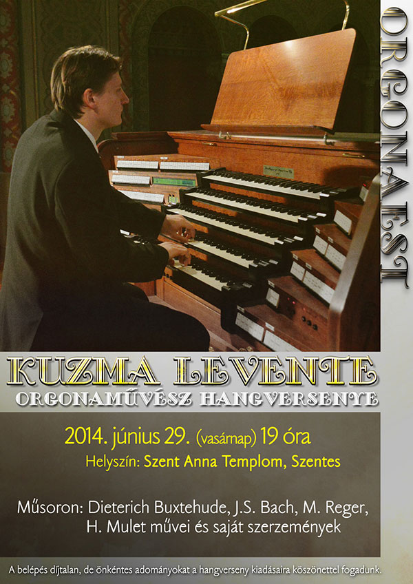 Az amerikai hangversenykörútja előtt, június 29-én, vasárnap 19 órakor hallhatjuk Kuzma Leventét, a fiatal szegedi művészt, aki a nemzetközi hangversenyéletben is komoly helyet vívott ki magának. Kuzma Levente 1978-ban született Göteborgban. Tanulmányait a Szegedi Tudományegyetem Pedagógiai és Zeneművészeti Karain végezte. 2001-ben ének-zene – karvezetés szakos diplomát, 2007-ben pedig kitüntetéses orgonaművész-tanári oklevelet szerzett Csanádi László növendékeként. Számos hazai és nemzetközi fesztivál, verseny résztvevője volt, nagy sikerű koncerteket adott Európa tíz országában és az Amerikai Egyesült Államokban. A 2009-es temesvári „Timorgelfest” Nemzetközi Orgonaverseny nagydíjasa, a 2011-es moszkvai „Alexander Gedike” Nemzetközi Orgonaverseny döntőse. Jelenleg a SZTE Ságvári Endre Gyakorló Gimnáziumának tanára és Piarista templom orgonistája. 2014/2015-ös hangversenyévadban a Waltman Artist’s (USA) szólistája lesz. Szeged város kétszeres művészeti díjjal kitüntetett orgonaművésze. A műsorban, az orgonairodalmat meghatározó szerzők, D. Buxtehude, J.S.Bach, M.Reger, H.Mulet művei mellett, az előadóművész improvizációjára is sor kerül. Szeretettel várunk mindenkit. Belépődíj nincs, de önkéntes adományokat köszönettel fogadunk.