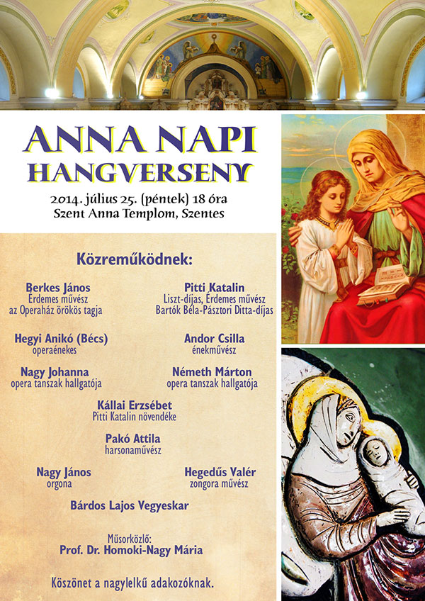 2014. július 25-én ANNA NAPI HANGVERSENY lesz Szentesen a Szent Anna Templomban, ahol olyan énekesek lépnek fel, mint Berkes János, Pitti Katalin, Hegyi Anikó, Andor Csilla, Nagy Johanna, Németh Márton, Kállai Erzsébet. Közreműködnek: Pakó Attila, Nagy János, Hegedűs Valér a Bárdos Lajos Vegyeskar.