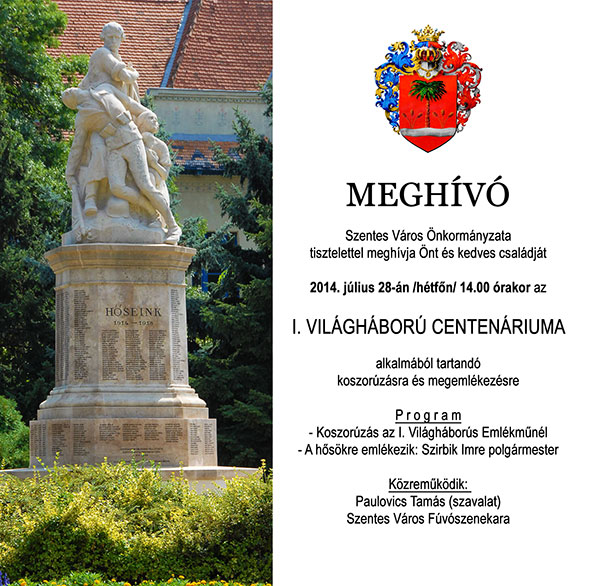 Szentes Város Önkormányzata tisztelettel meghívja Önt és kedves családját 2014. július 28-án /hétfőn/ 14.00 órakor az I. VILÁGHÁBORÚ CENTENÁRIUMA alkalmából tartandó koszorúzásra és megemlékezésre az Erzsébet téri I. Világháborús emlékműhöz.