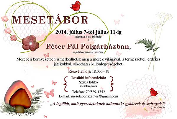 Mesetáborba várnak minden gyerkőcöt (napi háromszori étkezéssel) egy mesebeli környezetbe a Péter Pál Polgárházba. További információ a plakáton!