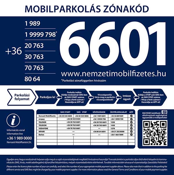 Ingyenesen letölthető alkalmazások (APP) segítségével egyszerűbb a mobilparkolás! Ügyeljen arra, hogy a rendszámát helyesen adja meg. Tranzakciónként a parkolási díjon felül kényelmi és kommunikációs (SMS, hívás, mobil adatforgalmi) díjat is kell fizetni.