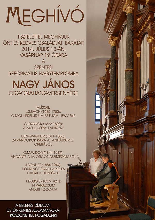 Tisztelettel meghívjuk Önt és kedves családját, barátait 2014. július 13-án, vasárnap 19 órára a szentesi Református Nagytemplomba N A G Y J Á N O S orgonahangversenyére
