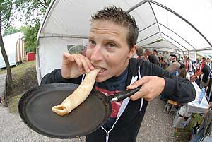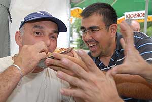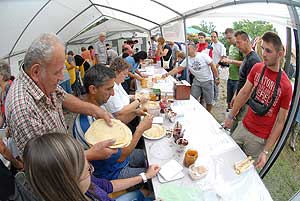 A számos tűzhelyen és a háromszor-négyszer annyi serpenyőben ipari mennyiségben gyártották a palacsintákat, az édesség osztásában a szentesi alpolgármester, Szűcs Lajos is részt vett. Tavaly a sütésben jeleskedett, 360 palacsintát készített.