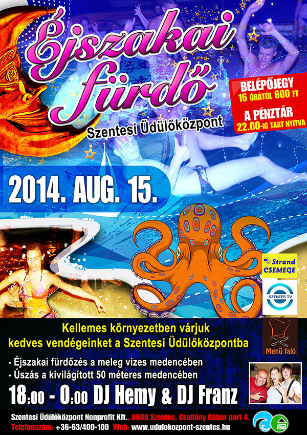 Kellemes környezetben várjuk kedves vendégeinket a Szentesi Üdülőközpontba. Éjszakai fürdőzés a meleg vizes medencékben. Úszás a kivilágított 50 méteres medencében. 18:00 - 0:00 DJ Hemy & DJ Franz Belépőjegy 16 órától 600 Ft. Pénztár 22:00-ig nyitva!