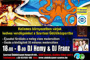 Kellemes környezetben várjuk kedves vendégeinket a Szentesi Üdülőközpontba. Éjszakai fürdőzés a meleg vizes medencékben. Úszás a kivilágított 50 méteres medencében. 18:00 - 0:00 DJ Hemy & DJ Franz Belépőjegy 16 órától 600 Ft. Pénztár 22:00-ig nyitva!