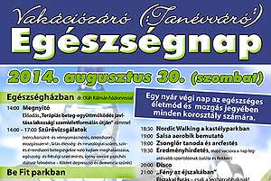 Hamarosan vége a nyárnak és ha szeretnének méltóképpen lezárni egy pörgős, vetélkedőkben és sok-sok mozgásban gazdag programmal, akkor Várunk Téged is, hogy töltsd velünk az utolsó nyári hétvége szombatját 2014. augusztus 30-án a művelődési ház és egészségház környékére, ahol a két intézmény összefogva az Egészségfejlesztési Program keretében Vakációzáró Tanévbúcsúztató Egészségnapot szervez. A nap folyamán sok nyeremény, meglepetések és a jókedv garantált!