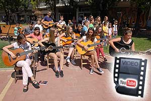 Szentesen tart a Zenével a Rákos Gyermekekért Alapítvány nyári zenei tábort, ahol együtt táboroznak az egészséges és a rákbetegségen túlesett gyerekek. A táborozók az ország számos tájáról érkeztek, általában itt fognak először gitárt a kezükbe - mondta Seres Antal a tábor vezetője. A szentesi tanítványok napközben bekapcsolódhatnak a közös munkába és ennek gyümölcseként élvezhettük a résztvevők szabadtéri koncertjét a Kossuth téren a Napernyős hölgy szobornál. Katt a képre! Szentes, 2014. 08. 15.