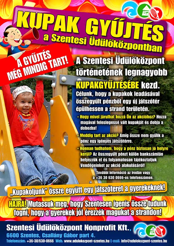 A Szentesi Üdülőközpont történetének legnagyobb KUPAKGYŰJTÉSÉBE kezdett. Céljuk, hogy a kupakok leadásával összegyűlt pénzből egy új játszótér épülhessen a strand területén. Hogy mivel járulhat hozzá Ön az akcióhoz? Hozza magával feleslegessé vált kupakját és dobja a dobozba! Meddig tart az akció? Amíg össze nem gyűlik a pénz egy igényes játszótérre. Honnan tudhatom, hogy a pénz biztosan jó helyre kerül? Az összegyűlt pénzt külön bankszámlán helyezik el és folyamatosan tájékoztatják a Vendégeiket az akció alakulásáról!