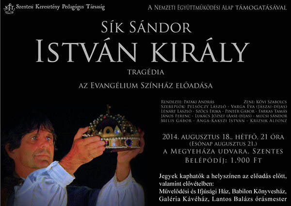 Az Evangélium Színház - Sík Sándor: István király tragédiáját tekinthetjük meg augusztus 18-án hétfőn 21.00 órakor a Szentesi Nyári Szabadtéri Színház keretében. Az előadást a Szentesi Keresztény Pedagógusok Társaságának szervezésében kerül bemutatásra.