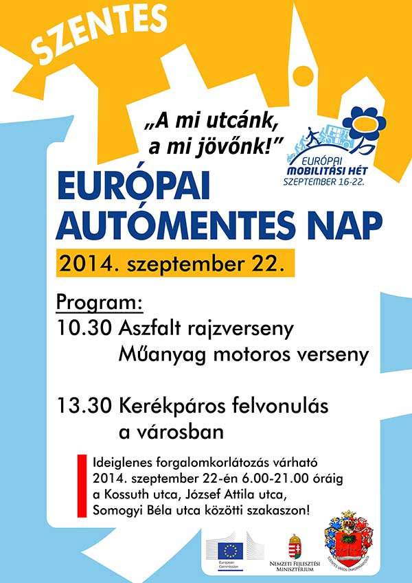 1997 óta évenként ugyanabban az időpontban - szeptember 22-én - kerül megrendezésre az Európai Autómentes Nap. Szentes is évek óta megtartja az Európai Autómentes napi rendezvényét és ezért 2014. szeptember 22-én hétfőn 6.00-21.00 óra között a Kossuth L. utca (József A. u. - Somogyi B. utcák közötti szakaszán) ideiglenes forgalomkorlátozás léptet életbe.