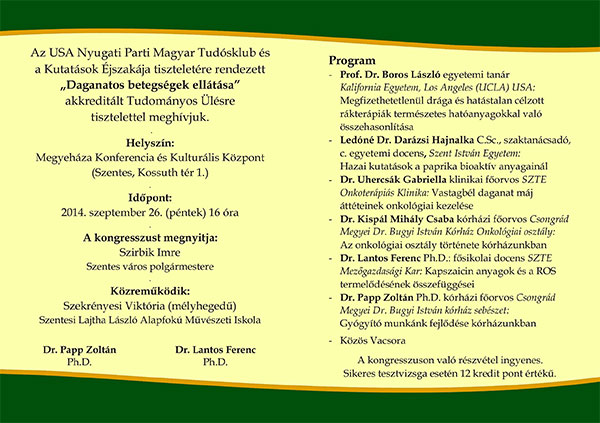 2014. szeptember 26-án pénteken 16 órától az USA Nyugati Parti Magyar Tudósklub és a Kutatások Éjszakája tiszteletére tudományos ülést szerveznek a Megyeháza Konferencia és Kulturális Központban. A neves előadók a daganatos betegségek ellátása témakörében ismertetik a legújabb kutatási eredményeket és az onkoterápia szentesi vonatkozásait. A kongresszuson való részvétel szentesi önkormányzat, a helyi és csongrádi vállalkozások támogatásának köszönhetően ingyenes. Minden érdeklődőt várnak a rendezők: dr. Lantos Ferenc Ph.D. és dr. Papp Zoltán Ph.D.