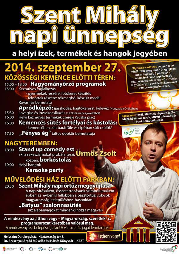A 2014. évi derekegyházi Szent Mihály nap a helyi ízek, termékek és hangok jegyében telik: 2014.09.27-én 15 órától hagyományőrző programok kezdődnek: felnőtt és gyermek kézműves foglalkozások, rovásírás bemutató, sütés a közösségi kemencében, táltos dobosok bemutatója, helyi termékek cseréje, fotókiállítás hagyományainkról és természeti értékeinkről. 18 órától stand up comedy est borkóstolóval, hagyományos ételekből készült menüvel, majd karaoke party. Országosan egyeztetett időpontban tűzgyújtás, majd közös szalonnasütéssel, tánccal, énekléssel záródik a program.