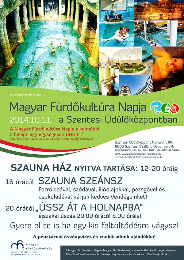 A Magyar Fürdőkultúra Napját minden év októberének második szombatjára tűzi ki a Magyar Fürdőszövetség, mely az idén október 11-i dátumra esik. A központi kommunikációval, megjelenésekkel a magyarországi termálvizeket, gyógyvizeket kívánják fókuszba állítani. Fel kívánják hívni a figyelmet az ország páratlan értékeire, az abban rejlő turisztikai potenciálra. A Szentesi Üdülőközpont is kapcsolódott a szövetség által szervezett kezdeményezéshez, így ezen a napon szauna szeánsz és éjszakai úszással várják az úszókat és a fürdőzni vágyókat.