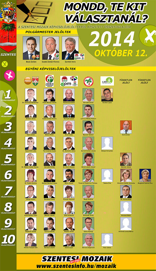 MONDD, TE KIT VÁLASZTANÁL? Összefoglaló a Szentesen induló egyéni képviselő- és polgármester jelöltekről Eltelt négy év és újra választ az ország! Jelen esetben polgármestereket, egyéni önkormányzati képviselőket, valamint megyei közgyűlésbe jelöl pártokat. Szentesen 51 egyéni képviselőjelölt és három polgármester jelölt közül lehet választani, amely jelölteket egy plakátra szerkesztettünk a jobb tájékozódás reményében.