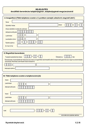 A bejelentésben a nevet, lakcímet, adóazonosító jelet, a desztillálóberendezés feletti tulajdonszerzés időpontját és a desztilláló-berendezés űrtartalmát kell megadni, továbbá a berendezés tárolásának, használatának helyét is, ha az eltér a magánfőző lakcímétől.
