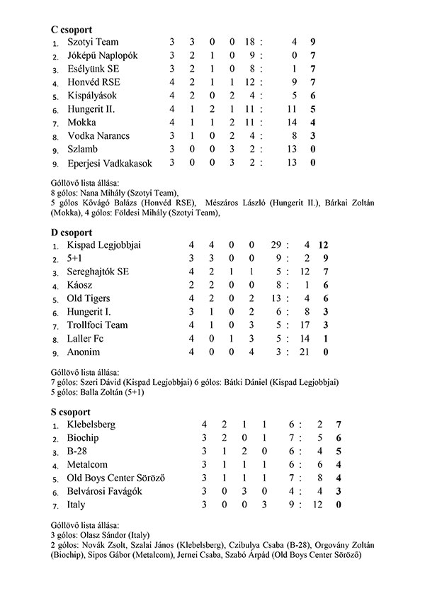 VIII. játéknap Regionális teremlabdarúgó bajnokság aHUNGERIT Kupáért 2015. február 1. 8:25 „D” Anonim – Hungerit I. 9:00 „C” Eperjesi VK – Esélyünk SE 9:35 „C” Kispályások – Honvéd RSE 10:10 „C” Szotyi Team – Jóképű Naplopók 10:45 „C” Eperjesi VK - Mokka 11:20 „C” Jóképű Naplopók - Szlamb 11:55 „D” Káosz – 5+1 12:30 „D” Hungerit II. – Vodkanarancs 13:05 „D” Káosz – Trollfoci Team 14:00 „S” Metalcom S – Italy 14:35 „S” Biochip - Belvárosi Favágók 15:05 „B” Dream Team -Tűzoltóság 15:40 „S”Old Boys Center Söröző – B28 16:15 „D” Old Tigers – Laller Fc 16:50 „A” Mező Trógerek - Favorit 17:25 „B” Bundás Liba – Bandi -ták 18:00 „A” Titánok – F(ÁBIJÁN) TC 18:35 „A” Metalcom - Jévék 19:10 „A” Mező Trógerek - Titánok 19:45 „A” Metalcom – F(ÁBIJÁN)TC