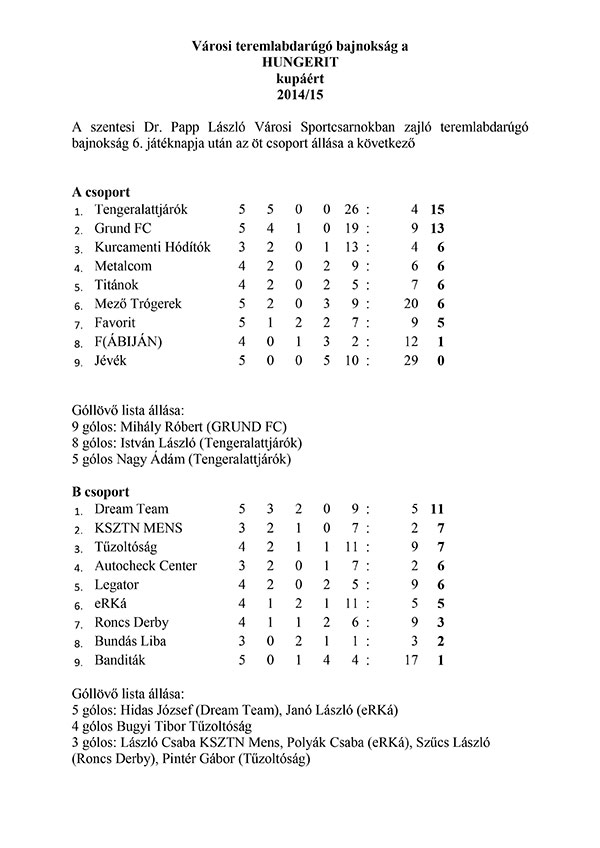 Folytatódik a Városi teremlabdarúgó bajnokság a HUNGERIT kupáért a Dr. Papp László Városi Sportcsarnokban, ahol 2015. január 25-én rendezték a VI. játéknapot. Délelőtt még az ugrókötelesek uralták a csarnokot, de délután már a focié volt a főszerep. Az esti mérkőzéseknél már nagy volt a csúszás, mert ezen a játéknapon kétszer kellett kihívni a mentőt sérülések miatt. Ezúton kérünk minden sportolót, hogy vigyázzon maga és játékostársa egészségére, és a bemelegítést is vegyék komolyan. Jó sportolást!