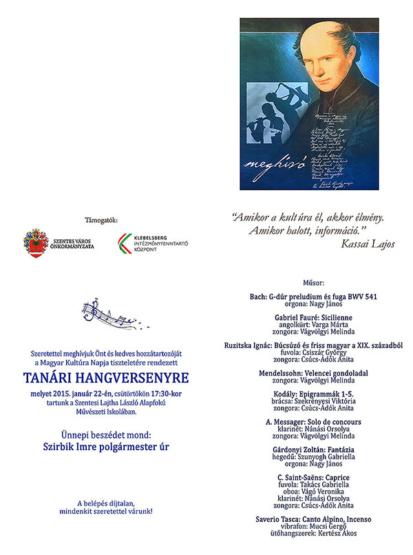 A város évek óta Tanári Hangversennyel ünnepli meg a Lajtha László Alapfokú Művészeti Iskolában a Magyar Kultúra Napját. Így történt ez most is 2015. január 22-én, amikor az iskola tanárai adtak hangversenyt az ünnep alkalmából.