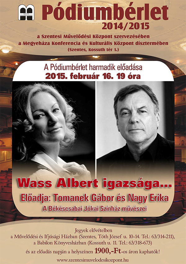 Wass Albert igazsága Pódium bérlet következő előadása Az író születésének 100. évfordulója alkalmából állították össze ezt a műsort. Az irodalmi est az életrajzi adatok ismertetése mellett széles keresztmetszetet mutat be Wass Albert irodalmi munkásságából, ahol mesék, versek, regény és levél részletek hangzanak el. Idézetek hangzanak el a „Wass Albert igazsága” című könyvből is, melyet a fiai írtak róla. Wass Albert igazsága… (2015. február 16.) Előadja: Tomanek Gábor és Nagy Erika a Békéscsabai Jókai Színház művészei Szerkesztette: Tomanek Gábor