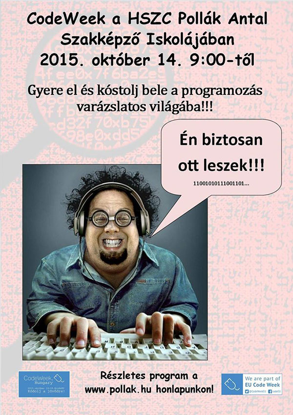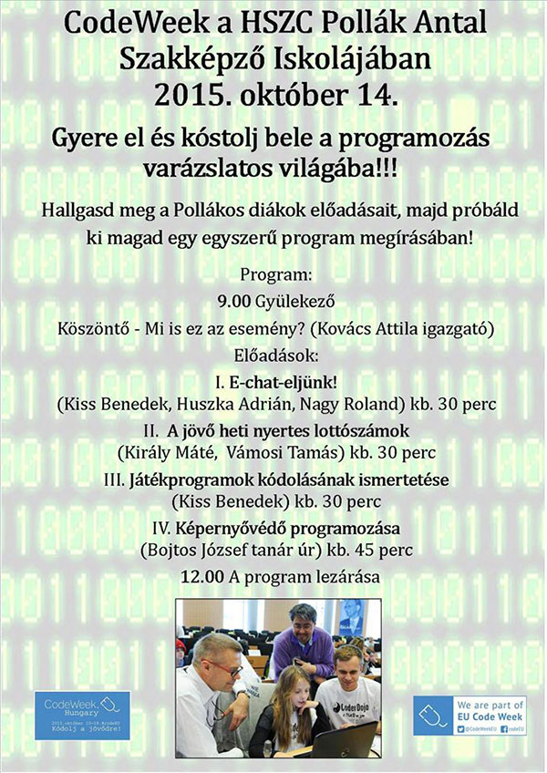 2015. október 14-én várják az iskolák, tanárok, cégek és vállalkozások jelentkezését, hogy minél több programmal tegyék vonzóvá és érdekessé a fiatalok számára a kódolást, eloszlassák a tévhiteket, és hogy népszerűsítsék a programozást a szentesi HSZC Pollák Antal Szakképző Iskolában.