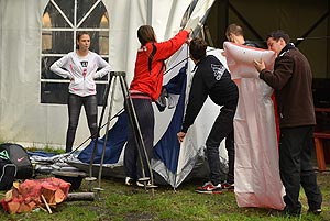 Az eső szokás szerint idén sem kerülte el a kalandvetélkedőt, így a játékmesterek bölcsen megcseréltek egy-két versenyszámot, hogy a sár és eső a lehető legkisebb mértékben befolyásolhassa az eredményeket. 08:00-09:00 Irány a „szikla” (1-5 bázispont) + 1 bázispont - Kalandpark Ebben a versenyszámban is mindenkinek részt kellett vennie. Egyszerre két csapat mászott két bekötéssel a mászó falon, de a végeredményt a mért idő adta meg. Mindenkinek fel kellett mászni, és ott megérinteni a fal tetejét. Ezt követően került bekötésre a következő csapattag (a bekötés idejére állt az óra). Az utolsónak kijelölt mászónak bekötött szemmel kellett teljesítenie a feladatot! A leggyorsabban mászó csapatnak a Pollák bizonyult.