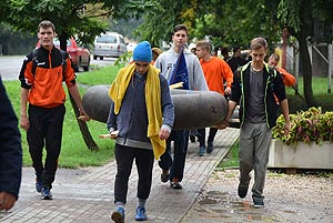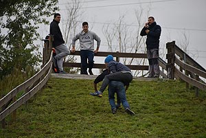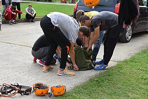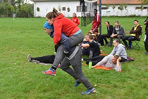 14:30- 15:10 Mentőakció a völgyből (1-5 bázispont) - Kalandpark A feladat során a völgyből kellett kimenekülni a csapatoknak a „közelgő árvíz” miatt. Sajnos a társak egy részre megsérült, ezért őket az adott csapattagnak a hátán kellett kimentenie. Érdemes volt taktikázni, mert minden esetben az maradt a dombon, aki a másikat mentette. Így a jól taktikázó csapatoknál a legnagyobb súlyú részt vevő vitte fel elsőként a társát, és legutoljára vitték fel a csapat legkönnyebb tagját (többnyire a lányokat). Egyedül a MEZGÉ nem taktikázott így, és a kalandvetélkedő sorozatának vélhetően legvékonyabb lány tagjával vitették fel egy kb. 80 kilós társukatJ. A legjobban taktikázott, és leggyorsabb volt a Zsoldos.