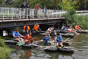 15:30- 16:10 A hajótöröttek küzdelme (1-5 bázispont) - Kurca És végre eljött a várva várt idő! Kezdődhetett a Harc a kincsért sorozat eddigi legizgalmasabb és legnehezebb evezős feladata, a „Hajótöröttek küzdelme”. A csapatoknak az előző napon elkészített tutajokkal kellett megtenni a Művelődési Központ mögötti híd és az Eszperantó híd közötti távot. A versenyszám biztonságos lebonyolításáról Gerecz elemér Horgászegyesület, és ismét a szentesi Tűzoltók (Katasztrófavédők) gondoskodtak motoros csónakokkal. A versenyszámhoz az evezőket és a mellényeket szokás szerint a HMG biztosította. Már az indulás előtt is tapintható volt a feszültség a résztvevőkön. A Pollák tutaja a vízre tételkor egy reccsenéssel jelezte, hogy nem lesz könnyű dolguk az idei kurcás feladat során. Szerencsére a nagyméretű autógumi belsők gondoskodtak arról, hogy a tutajok ne tudjanak elsüllyedni. Elrajtoltak a csapatok. Aki nem tudott a versenyről, az is hallotta, mert a rajtot követően egyből heroikus küzdelem alakult ki a csere csapattagok hihetetlen buzdítása mellett. A tutajokon először két csapatag szállt vízre, majd a kőhíd után újabb két csapattag folytatta a versenyt. A MEZGÉ csapata meglepően hosszú időt töltött a működő szökőkút alatt, és nyilvánvalóan nem azért, mert túl nagy volt a forróság. A Pollák csapatagjai maguk előtt tolva a tutajt úszva tették meg az utolsó távot a kellemes hőmérsékletűnek nem igen mondható, kb. 16 fokos vízben. A HMG egyik hőse egyedül maradt a küzdelem végére, és szinte felfoghatatlan erővel a vízben úszva egyedül húzta át a csapat tutaját a célvonalon. Minden csapat rendkívül nagyot küzdött, de végül a KÖZGÉ csapata ért be elsőként.