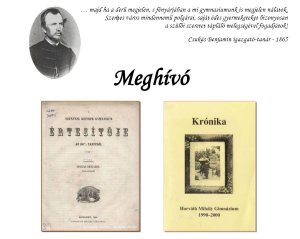 A Gimnáziumi Értesítők másfél évszázada 150 éve jelent meg az első kötet, 15 éve az utolsó http://ekonyvtar.vksz.hu/?docId=38807 1865-ben, épp másfél évszázaddal ezelőtt jelent meg első ízben a Szentesi Református Gymnasium Értesítője Csukás Benjamin igazgató- tanár szer-kesztésében. Ebből az alkalomból a Városi Könyvtárban előadást tart Labádi Lajos főlevéltáros és Tímár Ferenc informatikus-könyvtáros 2015. október 28-án szerdán este 18 órai kezdettel. Az előadás nyomtatható meghívója ITT!